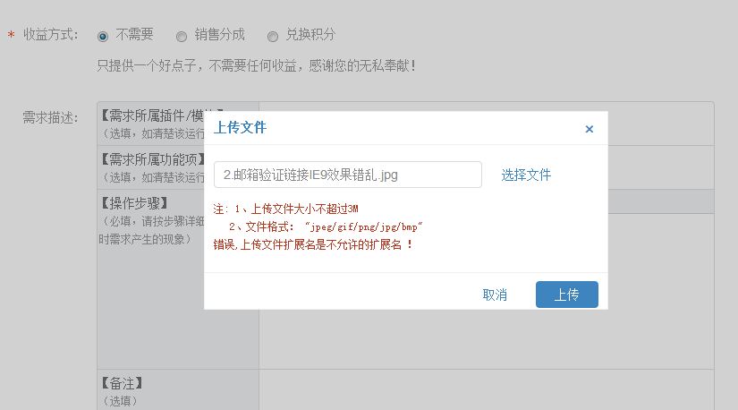 2.在【操作步骤】点击最右侧图片图标,点击上传一个图片名称中带“.”的图片或扩展名为大写的图片,系统提示“错误,上传文件扩展名是不允许的扩展名 !”
