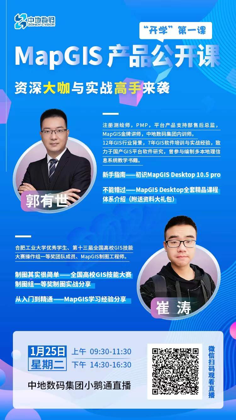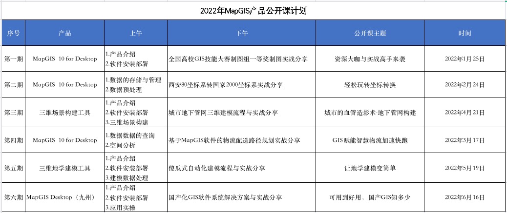 2022年MapGIS产品公开课是面向所有MapGIS用户举办的免费的线上公开课,每月一期,全年共12期。每期公开课时长一天,内容覆盖多款MapGIS产品,上午主要以介绍产品功能,下午分享实际项目应用案例。